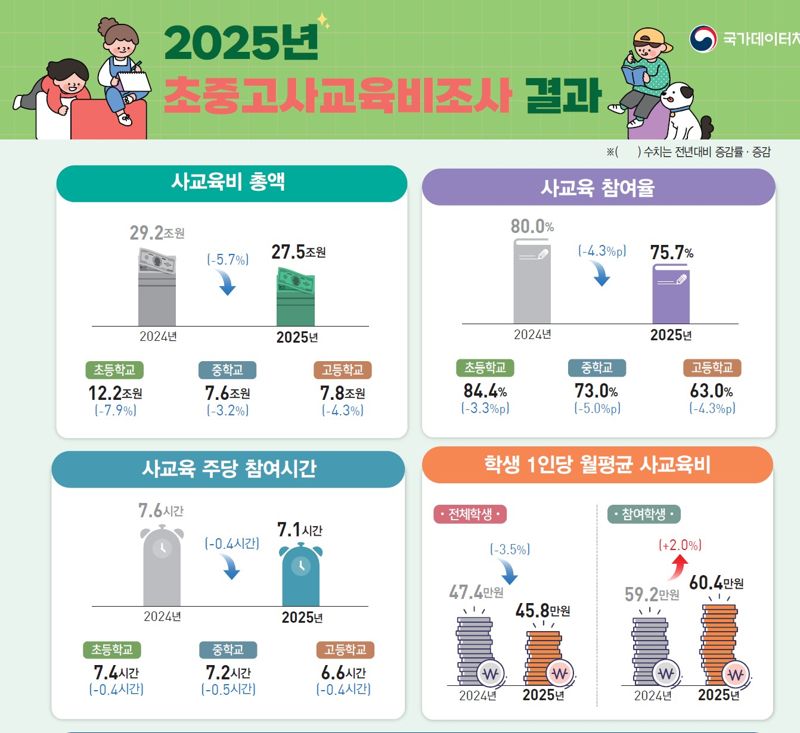 12일 국가데이터처 ‘2025년 초중고사교육비조사 결과’에 따르면 지난해 사교육비 총액은 27조5000억원으로 전년대비 1조7000억원, 5.7% 감소했다.