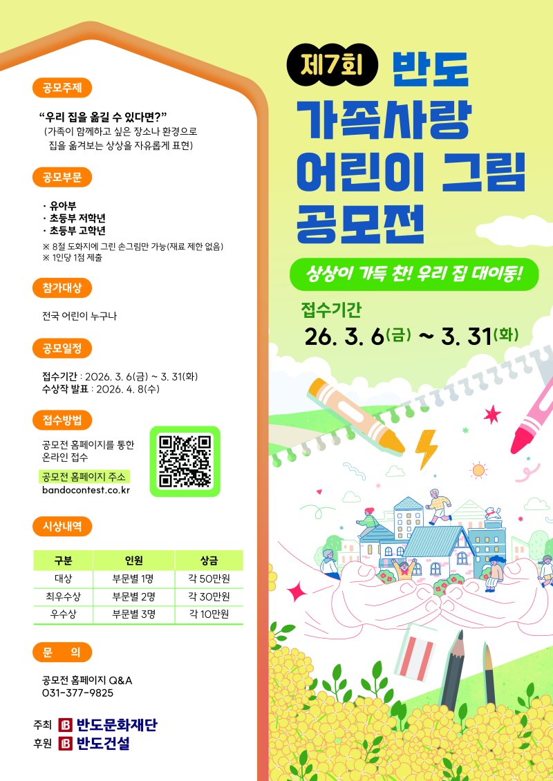 반도문화재단 권홍사 이사장은 “집은 한 가족의 시간과 추억이 담기는 삶의 터전”이라며“어린이들의 순수한 상상력을 통해 가족이 함께하는 공간의 의미를 다시 새기고 가족의 소중함을 되새기는 계기가 되길 바란다”고 밝혔다.