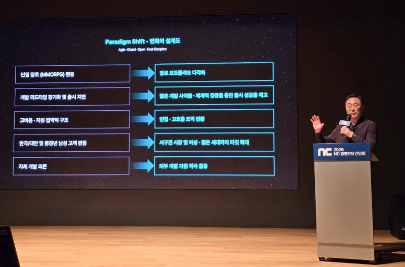 지난 12일 오전 경기 성남시 엔씨소프트 판교R&D 센터에서 열린 2026 엔씨 경영전략 간담회 현장. 박병무 엔씨소프트 공동대표가 '올해 매출 목표 2조 5000억원, 2030년 매출 목표 5조원, 자기자본이익률(ROE) 15% 이상을 달성'을 내세우자 관련 의구심이 섞인 질문이 쏟아졌다.