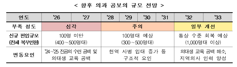 복지부는 현역 사병과의 복무기간 격차와 여학생 비율 증가 등 구조적 요인에 더해 최근 의정 갈등 여파로 의대생 군 휴학이 증가하면서 공보의 부족 문제가 당분간 지속될 것으로 전망했다. 정부는 최소 2031년까지 공보의 수급 불안이 이어질 가능성이 있는 것으로 보고 있다.