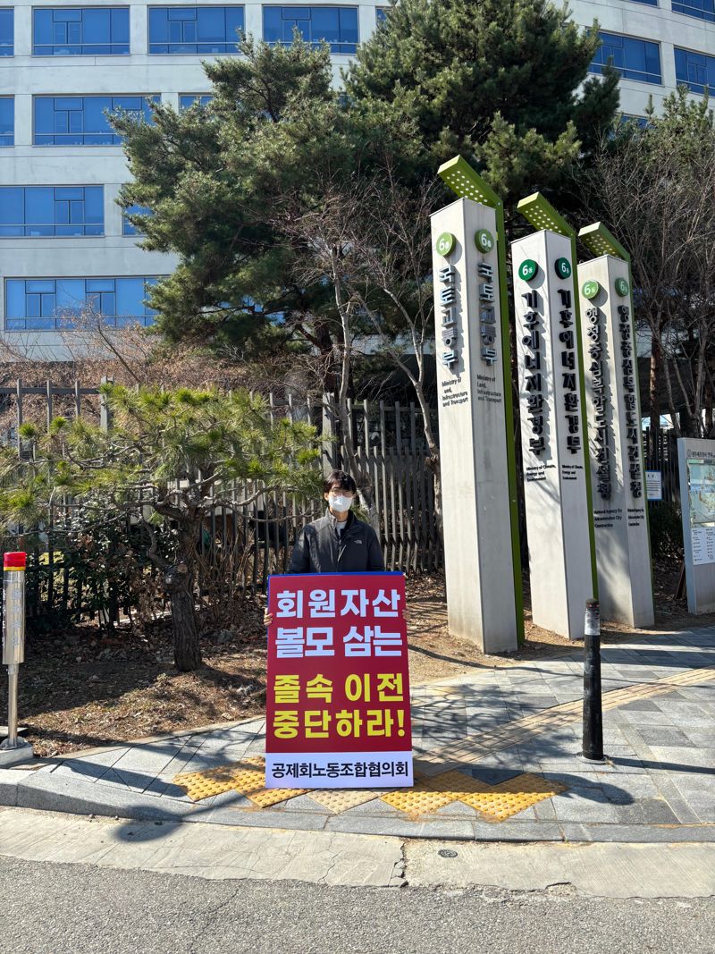 13일 공제회노조에 따르면 이날 노조원들은 국토교통부 앞에서 1위 시위를 진행했다.
