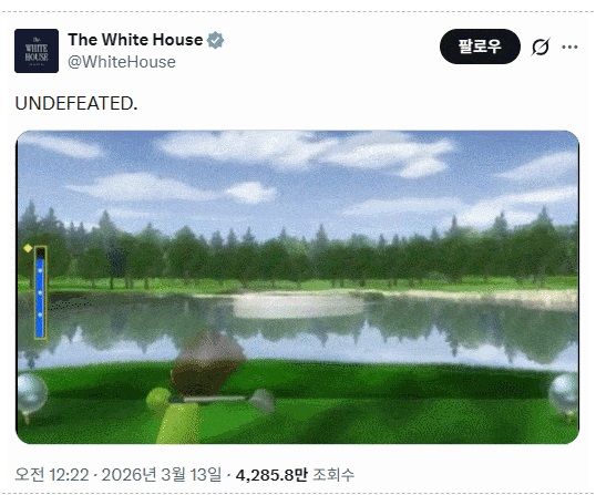 13일(현지시간) 백악관은 엑스(옛 트위터)에 ‘불패(UNDEFEATED)’라는 문구와 함께 전쟁 홍보 영상을 게시했다. 해당 영상은 닌텐도가 2006년 출시한 스포츠 게임 ‘Wii 스포츠’를 활용해 제작했다.
