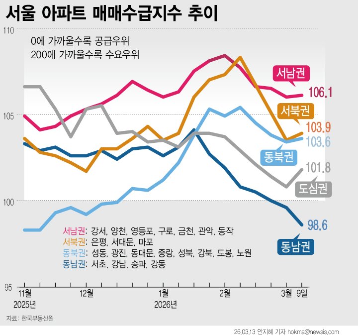 동남권을 제외한 권역에서는 ▲도심권(100.8→101.8) ▲동북권(103.4→103.6) ▲서북권(103.5→103.9) ▲서남권(106.0→106.1) 등으로 일제히 매매 수급지수가 상승했다.
