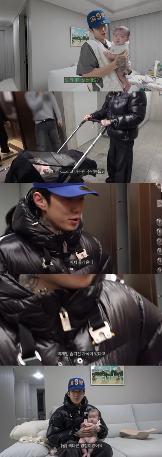 아기를 유아차에 태우고 산책에 나선 박재범은 집으로 돌아오는 길에 엘리베이터에서 이웃 주민을 마주쳤다.