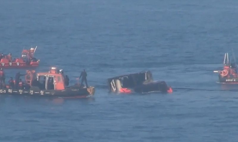 해경은 현재 함정 8척을 투입해 침몰 지점을 중심으로 반경 5해리 해역에서 야간 수색을 진행하고 있다. 사고 해역에는 초속 2~3m의 바람이 불고 있으며 약 1m 높이의 파도가 일고 있다. 수심은 약 80m로 확인됐다.