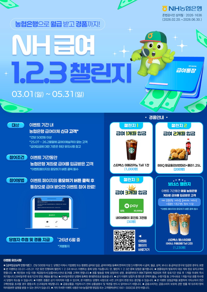 농협은행은 추첨을 통해 △급여 1개월 입금 시 스타벅스 아메리카노 1잔(1000명) △2개월 입금 시 BBQ 황금올리브반마리 세트(200명) △3개월 입금 시 네이버페이 포인트 3만원(30명)을 제공한다.