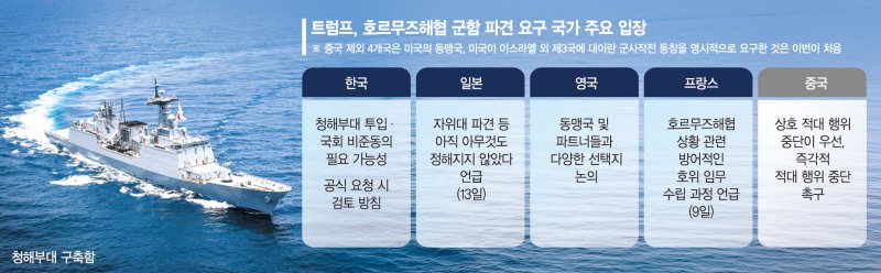 정부 관계자는 아직 미국으로부터 공식적인 파병 요청은 없다고 밝혔다. 정부는 공식 요청이 오면 심도 있게 검토하겠다는 입장이지만, 워낙 위험한 작전인 데다 이란을 적으로 돌릴 수 있어 신중해야 한다는 기류가 읽힌다.