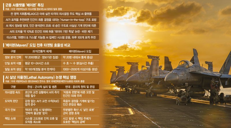 이 같은 혁신의 배경에는 미 국방부의 통합 AI '메이븐(MSS, Maven Smart System)'이 있었다. 이 시스템은 빅데이터 전문기업 '팔란티어'의 지능형 분석 플랫폼(AIP)과 '앤트로픽'의 생성형 AI '클로드(Claude)'가 결합된 형태다. 두 지능은 한 시스템 안에서 오판을 줄이는 교차 체크를 수행하며 전장에서 최적의 해답을 도출한다.