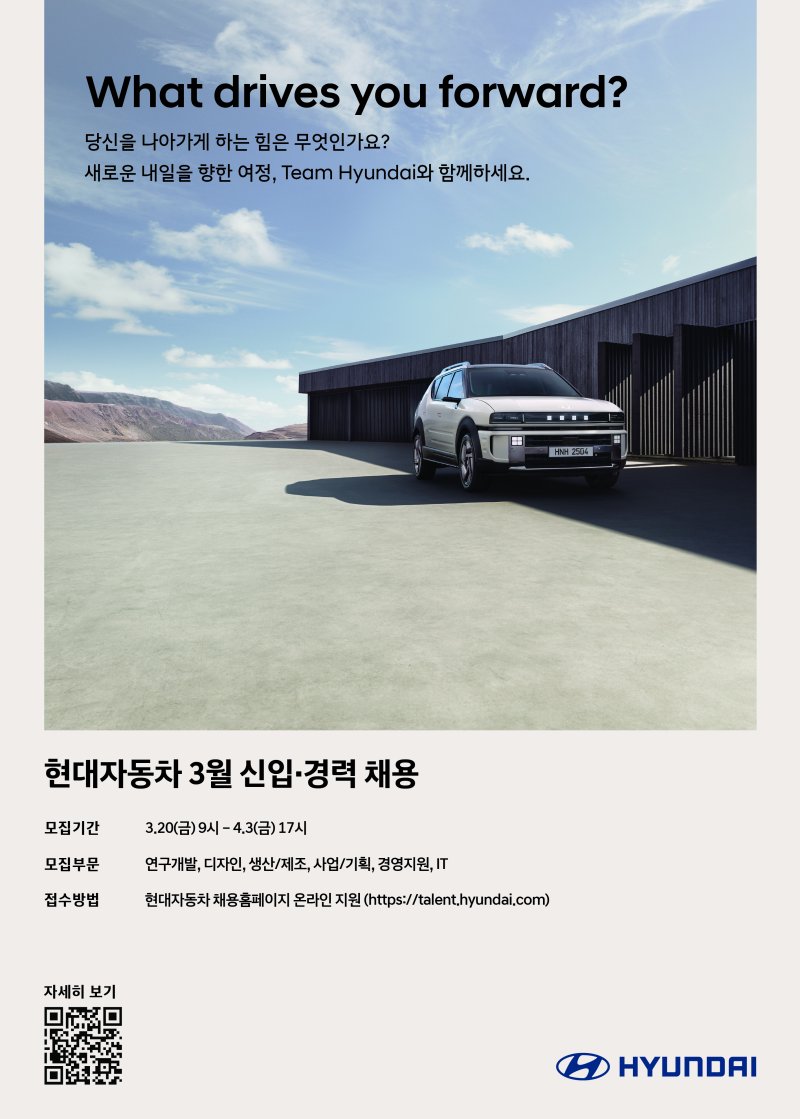 [파이낸셜뉴스] 현대차가 연구개발, 디자인, 생산, 기획 등 전 부문에서 차세대 모빌리티 패러다임 전환을 이끌 신입·경력 채용에 나선다.