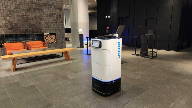 카카오모빌리티 로봇 서비스 ‘브링(BRING)’이 호텔에서 고객에게 어메니티를 배송하기 위해 이동하는 모습