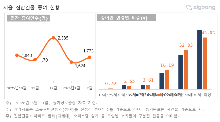 16일 부동산 플랫폼 직방이 대법원 등기정보광장의 소유권이전등기 통계를 분석한 결과, 서울의 증여인은 2026년 2월 1773명으로 1월(1624명)보다 증가한 것으로 나타났다.