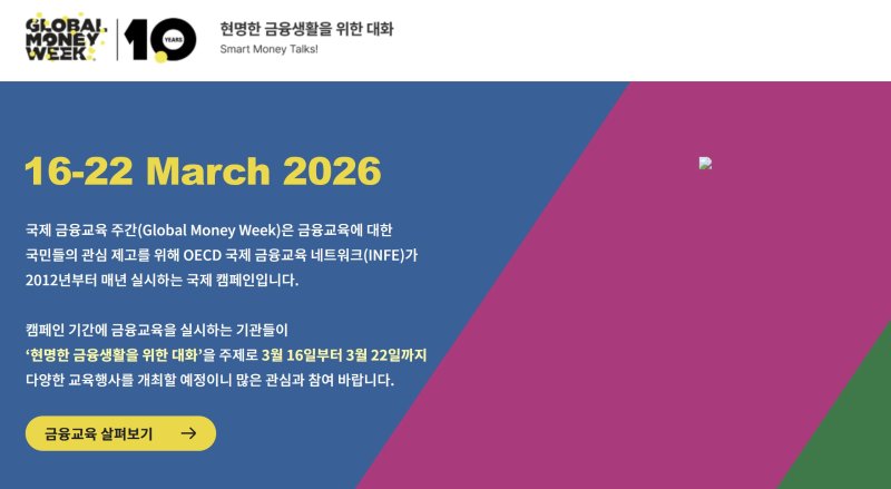 올해 국제 금융교육 주간의 주제는 '현명한 금융생활을 위한 대화'(Smart Money Talks)다. OECD는 금융생활에 있어 자신의 경험을 공유하고, 전문가들에게 질문함으로써 현명한 금융생활을 영위하고 금융 이해력을 향상시킬 수 있다고 강조했다. 지난해 한국에서는 금융당국은 물론 민·관 협동으로 진행된 행사에 총 1만5865명이 참여한 바 있다.