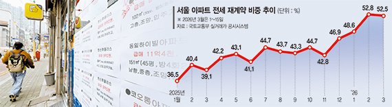 16일 국토교통부 실거래가 공시시스템에 따르면 서울 아파트 전세 재계약 비중은 지난해부터 계속 높아지고 있다. 지난해 1월 36.5%였던 해당 비중은 이재명 대통령이 취임한 6월 41%를 돌파했고 7월 44.7%, 12월 46.9%로 계속 높아졌다.