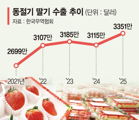 16일 한국무역협회에 따르면 동절기(10~1월) 기준 딸기 수출액은 3351만달러로 역대 최대치를 기록했다. 동절기 기준 지난 2021년 2699만달러에서 2022년 3107만달러, 2023년 3185만달러, 2024년 3115만달러를 기록하는 등 전반적으로 꾸준히 증가하고 있다. 주요 수출 대상국은 태국, 싱가포르, 홍콩 등 동남아시아 지역이다.
