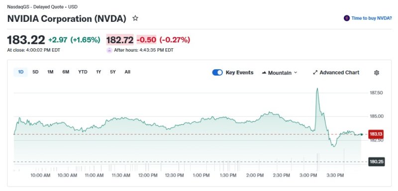 16일(현지 시각) 뉴욕증시에서 엔비디아는 1.65% 상승한 183.22달러를 기록했다. 이로써 시총도 4조4530억달러로 늘었다.