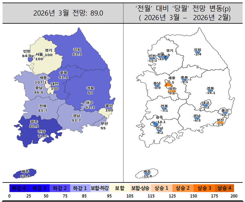 한편 3월 전국 자금조달지수는 전월 대비 0.5p 하락한 82.8, 자재수급지수는 2월보다 7.6p 하락한 96.6으로 전망됐다.