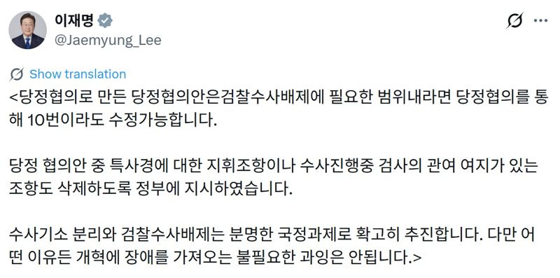 이 대통령은 이날 엑스(X·옛 트위터)를 통해 "수사 기소 분리와 검찰 수사 배제는 분명한 국정과제로 확고히 추진한다"며 이같이 적었다.