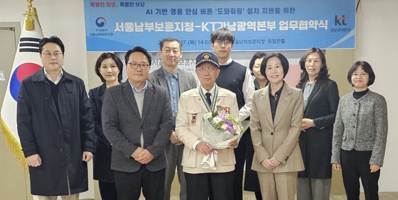 [파이낸셜뉴스] 국가보훈부 서울남부보훈지청(이하 지청)은 17일 KT와 6·25 참전 유공자의 안전한 일상 지원을 위한 ‘AI 기반 영웅 안심 버튼 도와줘링 설치 지원’ 업무 협약을 체결했다.