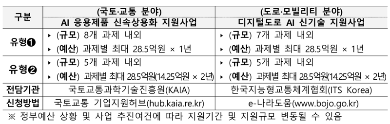 이번 사업은 산업과 일상 전반의 AI 전환을 가속화하기 위해 국토, 교통, 도로 등 국민 생활과 밀접한 분야를 중심으로 추진된다. 특히 1~2년 내 시장 출시가 가능한 과제를 발굴해 빠른 상용화를 유도하는 데 초점을 맞췄다.