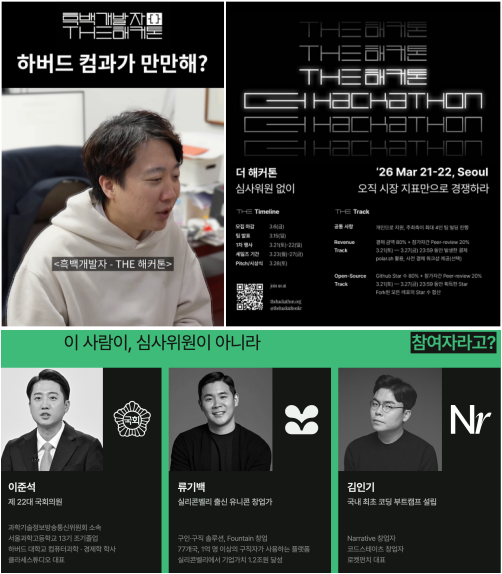 오는 21일 열리는 ‘더 해커톤’은 지난 8일 참여자 모집을 마감했다. 더 해커톤은 참여자인 이준석 대표를 22대 국회의원에 과학기술정보방송통신위원회 소속이라는 설명과 함께 서울과학고등학교 13기 조기졸업, 하버드 대학교 컴퓨터과학·경제학 학사, 클라세스튜디오 대표로 소개했다.