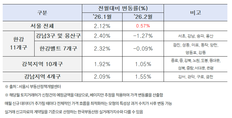 권역별로는 강북지역 10개구(강북·노원·도봉 등)는 전월 대비 1.05%, 강남지역 4개구(강서·관악·구로·금천)에서는 전월 대비 1.55% 상승했다. 반면 강남3구 및 용산구는 전월 대비 1.27%, 한강벨트 7개구는 0.09% 각각 하락했다.
