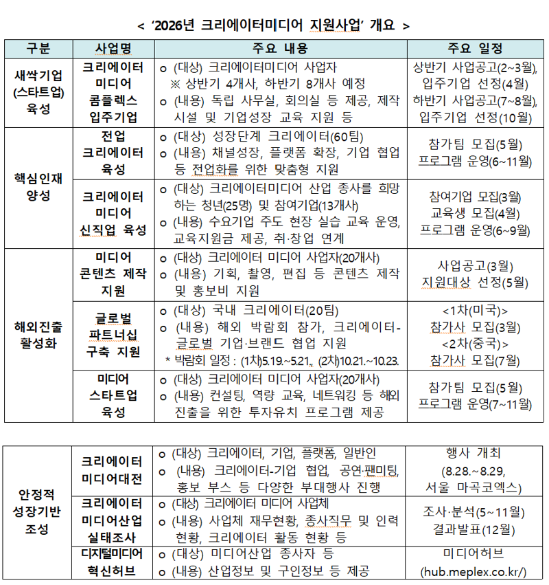 방미통위는 스타트업 육성을 위해 서울 마곡에 위치한 크리에이터미디어 콤플렉스를 입주기업 간 교류 및 사업화 컨설팅을 상시 지원하는 '크리에이터미디어 창업 허브'로 만들 계획이다. 입주기업들의 요청사항인 '홍보 부족'과 '지자체와의 협업 어려움'을 해결하기 위해 기술 및 서비스 등을 소개하는 안내서, 홍보 영상 등을 제작해 전국 지자체와 관련 기업들에 배포하고 사업 연결을 지원한다. 콤플렉스 입주기업 4개를 오는 30일까지 모집 중이며 하반기에 추가로 8개를 모집한다.