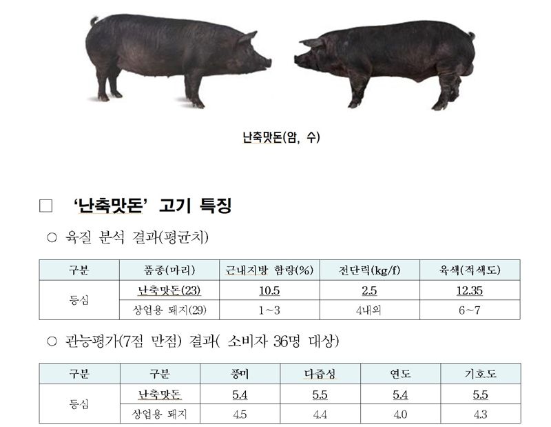 조 원장은 “앞다리나 뒷다리 같은 비선호 부위는 지방 함량이 낮기 때문에 다른 요리 방법으로 소비가 되고 있다”며 “난축맛돈은 일반 돼지에서 비선호 부위인 앞다리, 뒷다리 같은 곳에도 마블링이 잘 끼도록 개량됐다. 비선호 부위를 구이용으로 써도 식감이나 풍미가 있게 개발됐다”고 말했다.