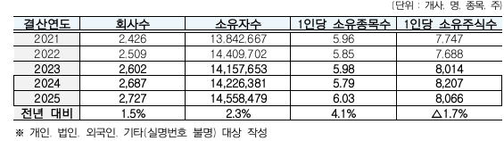 개인소유자가 약 1442만명(99.1%)으로 압도적이었으나 소유자 1인당 평균 소유주식수는 법인소유자가 약 77만주로 가장 많았다.