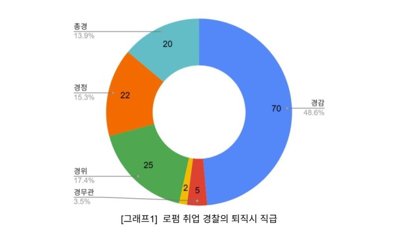또 취업이 허용된 144건 가운데 68건(47.2%)은 퇴직 후 3개월 이내에 로펌으로 이동했고 38건(26.4%)은 퇴직 후 1년이 되기 전에 재취업한 것으로 나타났다. 퇴직 당시 직급은 경감이 48.6%로 가장 많았고 경위와 경정이 뒤를 이었다.