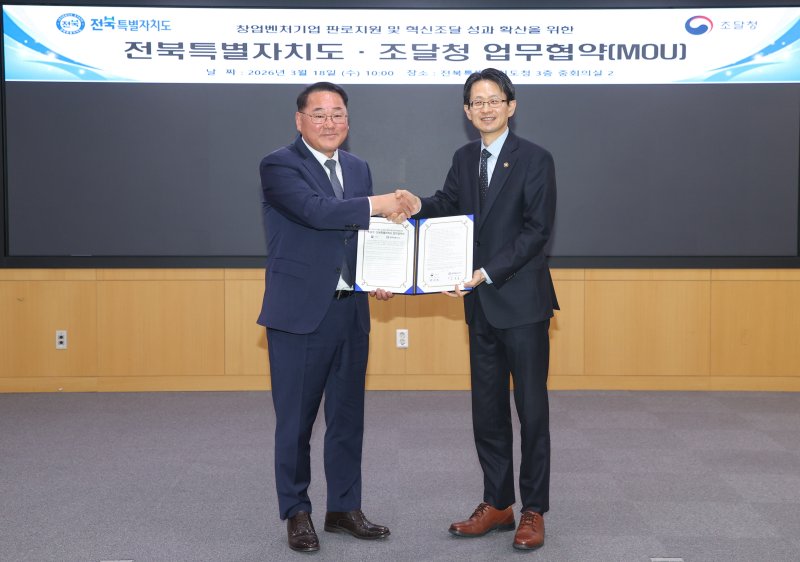 【파이낸셜뉴스 전주=강인 기자】 전북특별자치도는 18일 도청에서 조달청과 '창업 벤처기업 판로 지원 및 혁신조달 성과 확산을 위한 업무협약'을 맺었다.