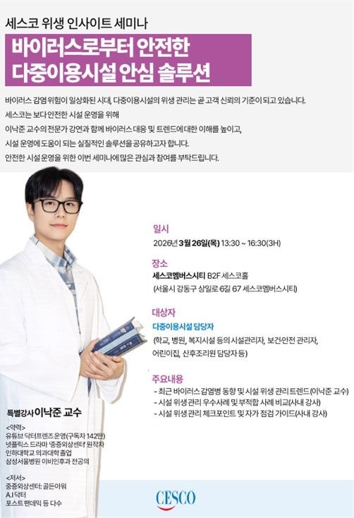 이어 세스코는 다중이용시설 위생관리 현장에서 축적한 관리 사례와 데이터를 기반으로 시설별 위생관리 방향과 점검 기준을 소개한다. 특히 사후 대응 중심으로 이뤄지는 기존 위생관리 방식의 한계를 짚고 세스코의 상시 예방 중심 위생관리 체계인 ‘바이러스케어’ 솔루션을 통해 감염 위험을 사전에 관리하는 방안을 제시할 계획이다.