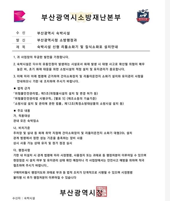 해당 공문에는 "숙박시설은 다수의 유동 인원이 발생하는 시설로서 화재 발생 시 대형 사고로 확산될 위험이 크다"며 "초기 화재 대응을 위한 기한 내 간이소화장치와 리튬이온전지 소화기를 설치하라"고 안내하고 있다.
