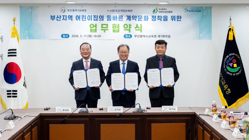 [파이낸셜뉴스] 한국교직원공제회(이하 교직원공제회)는 지난 17일 부산광역시교육청(이하 부산교육청), 부산광역시어린이집연합회(이하 부산어린이집연합회)와 함께 부산지역 어린이집의 올바른 계약문화 정착을 위한 3자 간 업무협약을 체결했다고 18일 밝혔다.