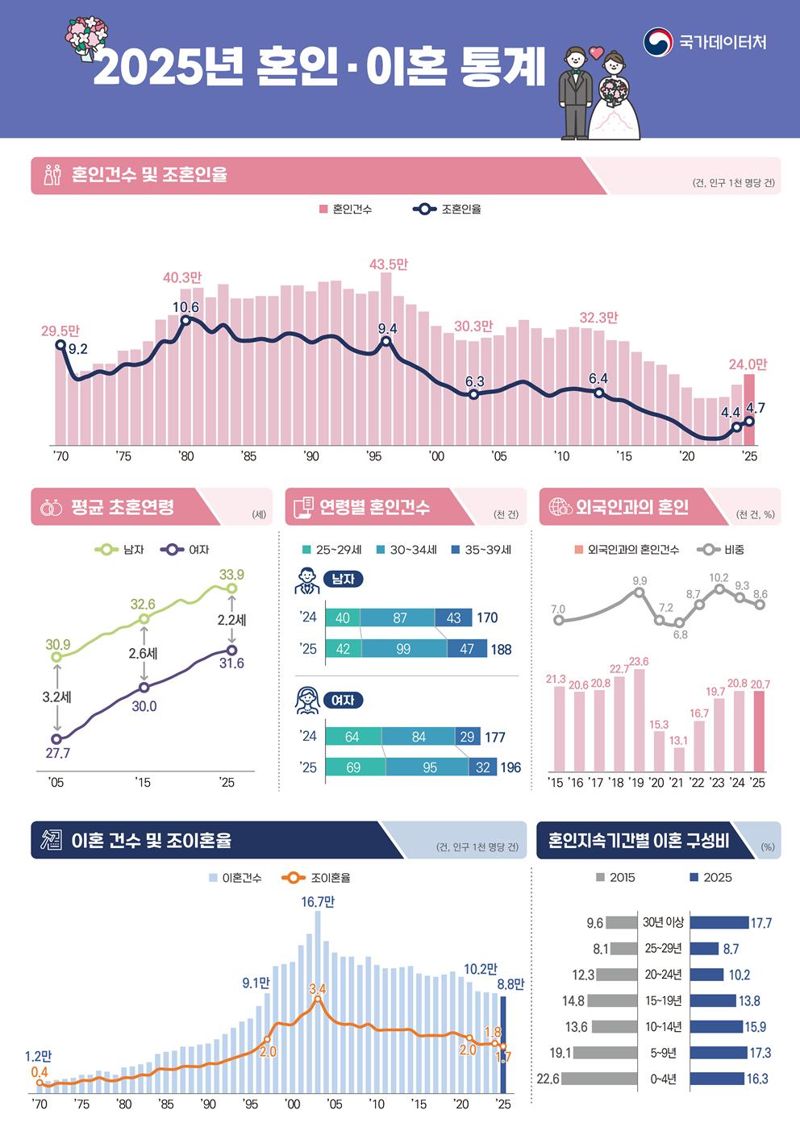 [파이낸셜뉴스]지난해 혼인건수는 24만건으로 1년 사이 1만8000건이 늘며 3년 연속 증가했다. 30대 초반 인구가 늘고 결혼에 대한 인식이 긍정적으로 바뀐 점이 영향을 미쳤다. 초혼 부부 중 여자가 나이가 더 많은 비중이 처음 20%를 넘어섰다. 다만, 혼인 증가폭은 2024년(14만8000건) 보다 축소됐다. 이혼건수는 8만8000건으로 전년대비 3000건이 줄었다.