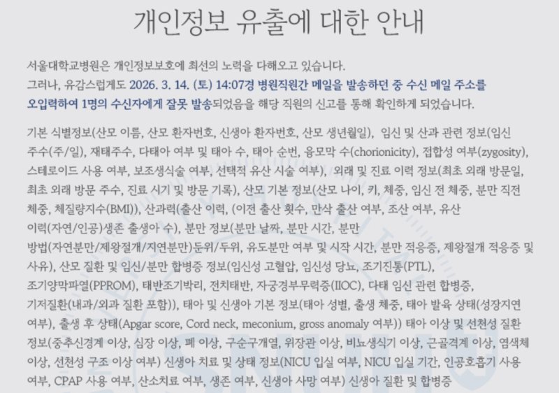 19일 서울대병원에 따르면 지난 14일 오후 2시 7분께 병원 직원 간 메일을 발송하던 중 직원이 수신 메일 주소를 잘못 입력해 수신자 1명에게 환자 정보가 잘못 발송됐다. 병원측은 이 사실을 해당 직원의 신고를 통해 확인했다.