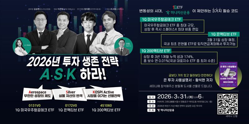 이번 세미나는 변동성 장세 속 올해 투자 생존 전략을 주제로 진행된다. 특히 우주항공테크, 은 현물 액티브 상장지수펀드(ETF), 코스피 액티브 ETF를 중심으로 한 'A.S.K' 시장 분석과 투자 전략이 제시될 예정이다.