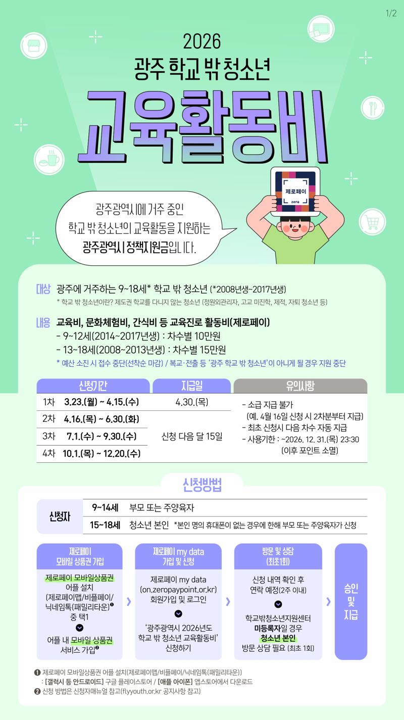 신청을 희망하는 청소년은 오는 23일부터 광주광역시학교밖청소년지원센터 누리집과 제로페이 마이데이터 누리집을 통해 온라인으로 접수하면 된다. 시·구 학교밖청소년지원센터는 신청자의 거주지와 자격 요건 등을 확인 후 최종 승인하며, 승인된 대상자에게는 해당 분기의 포인트가 지급된다.