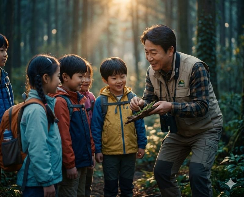 은퇴 후 자신이 가지고 있는 재능에 맞춰 얼마든지 사회에 기여할 수 있다. 매일 눈 뜰 때마다 '오늘은 뭘 할까' 고민이라면, 휴대폰으로 '1365 자원봉사포털'을 검색해 볼 일이다. 숲해설가의 모습을 생성형 AI로 제작한 이미지 /제미나이