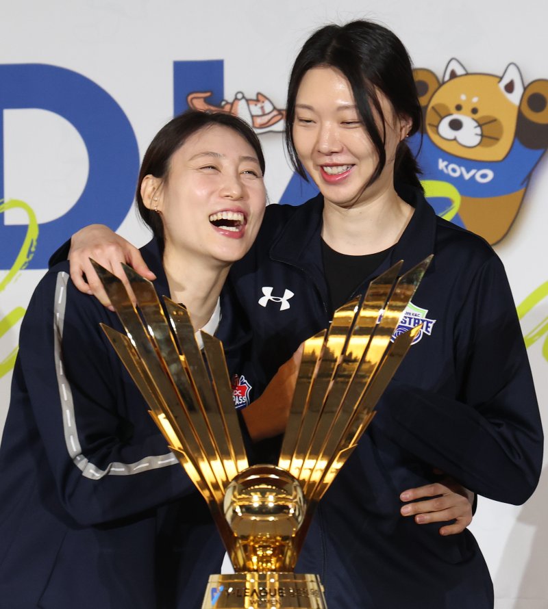 취재진이 우승을 '찜'하는 의미로 트로피에 손을 대는 포즈를 요청했는데, 양효진은 배유나의 손을 블로킹하듯 막아 세웠다. 둘의 장난에 함께 자리한 4명의 선수가 모두 함박웃음을 터뜨렸다.