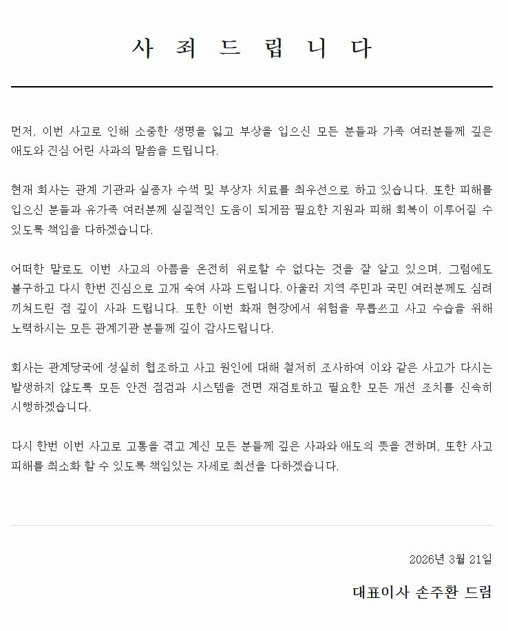 손 대표는 "회사는 관계 당국에 성실히 협조하고 사고 원인을 철저히 조사해 사고가 재발하지 않도록 모든 안전 점검과 시스템을 전면 재검토하겠다"며 "필요한 모든 개선 조치를 신속히 시행하겠다"고 약속했다. 손 대표는 화재 현장에서 유족들을 만나, 사죄의 뜻을 전한 것으로 알려졌다.