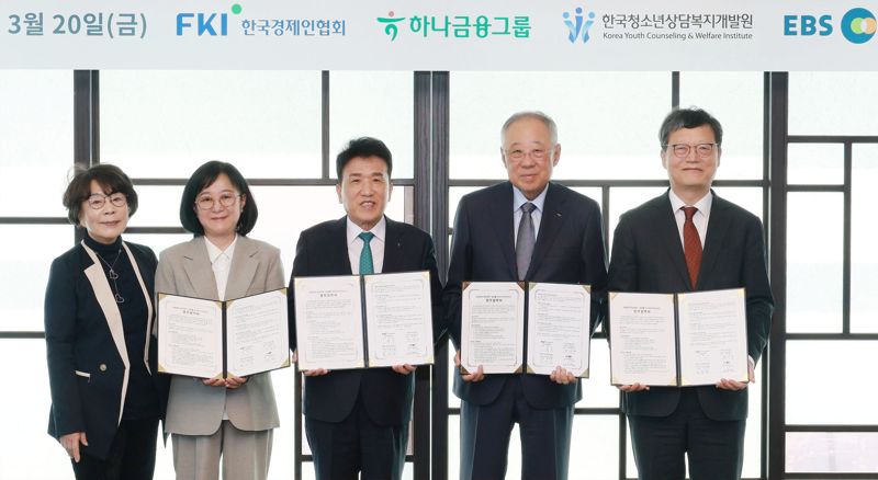 [파이낸셜뉴스] 한국경제인협회는 지난 20일 서울 여의도 FKI타워에서 하나금융그룹, 한국청소년상담복지개발원(한청원), 한국교육방송공사(EBS)와 학교 밖 청소년 재도약 사업인 '청년애(愛) 유스 브릿지' 운영 협력을 위한 업무협약을 체결했다고 22일 밝혔다.