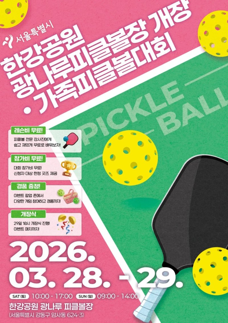 행사에는 서울시와 서울시체육회, 피클볼협회 관계자와 동호인, 시민 등 500여 명이 참여할 것으로 예상된다. 첫째 날에는 시민 참여형 사전경기가 진행되고, 둘째 날에는 개장식과 결승전이 열린다. 개장식은 29일 오전 10시에 진행된다.