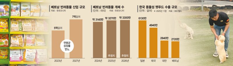 시장조사업체 유로모니터 조사에 따르면 2024년 기준 베트남의 반려동물 수는 약 3140만 마리에 달하는 것으로 나타났다. 그러나 2026년 기준으로는 3300만 마리가 넘을 것으로 업계는 추정하고 있다. 관련 산업 규모도 빠르게 확대되고 있다. 2023년 약 5억달러 수준이던 시장은 빠르게 성장해 2027년 7억달러(약 9000억원)를 훌쩍 넘어설 것으로 예상되고 있다. 연평균 성장률은 약 11%로, 업계에서는 베트남을 대표적인 '펫코노미' 신흥 시장으로 평가하고 있다.