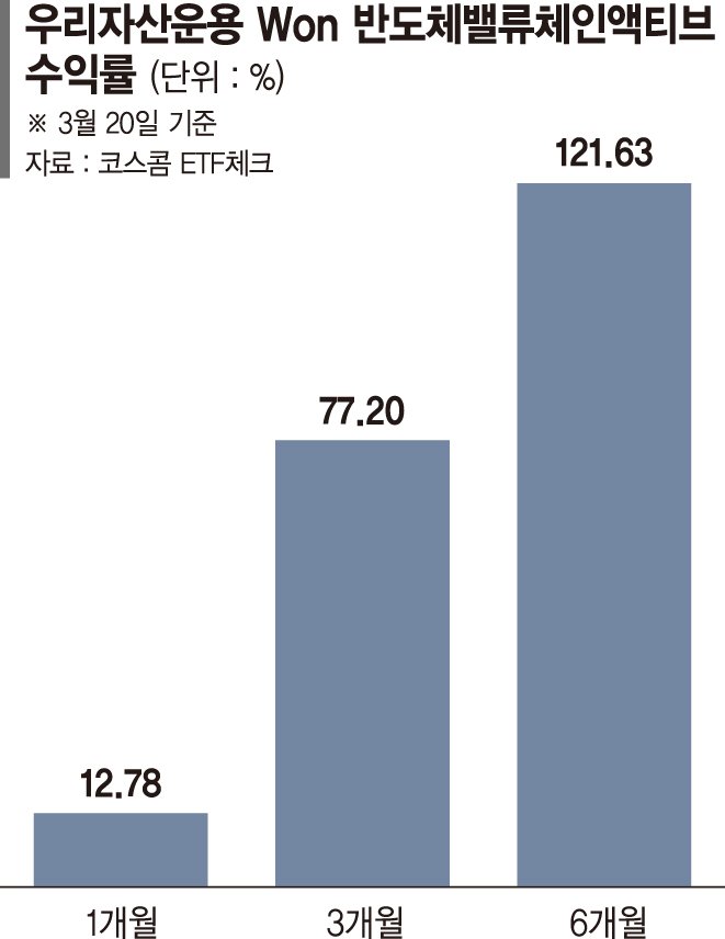 22일 코스콤 ETF체크에 따르면 지난 20일 기준 'Won 반도체밸류체인액티브'의 성과는 6개월 121.63%, 3개월 77.20%, 1개월 12.78%다.