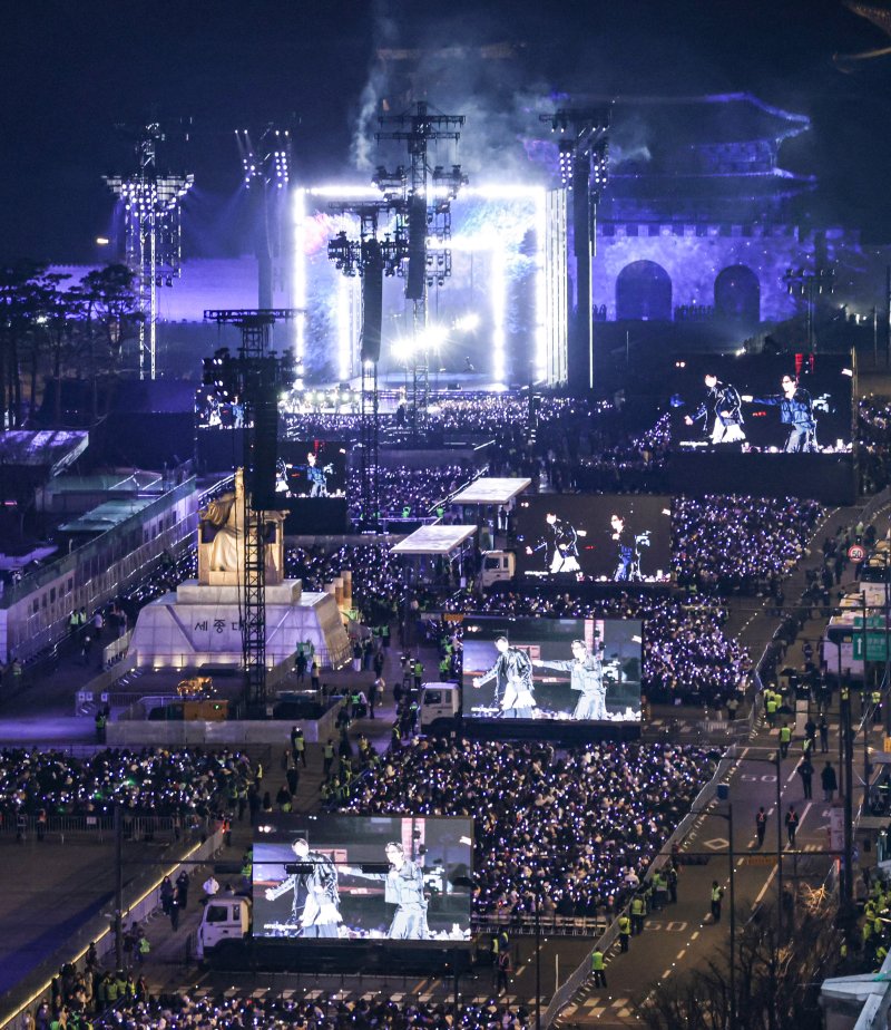 건물 3층 높이의 액자형 무대는 광화문과 일곱 멤버를 한 화면에 담아내며 상징성을 극대화했다. 광화문 외벽을 활용한 미디어 아트는 도심과 문화유산, BTS의 퍼포먼스를 유기적으로 결합해 장관을 연출했다. 약 1시간 동안 이어진 공연은 응원봉 '아미밤'과 무대 연출이 유기적으로 맞물리며, 광장 전체를 다양한 빛으로 물들였다.