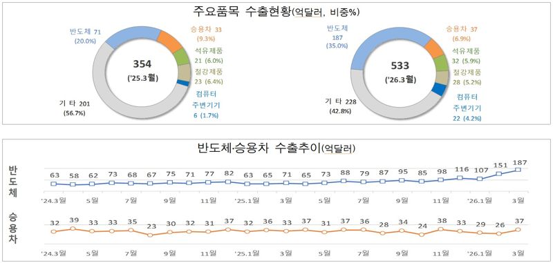 주요 수출 품목별로 반도체(163.9%)와 승용차(11.1%), 석유제품(49.0%), 컴퓨터 주변기기(269.4%) 등이 늘었고 선박(-3.9%) 등은 줄었다. 특히 반도체 수출액은 187억달러로 같은 기간 기준 역대 최대치를 기록했다. 반도체 수출 비중은 35.0%로 1년 전보다 15.1%p 상승했다.