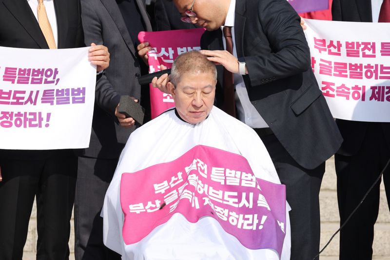 23일 부산시에 따르면 박 시장은 이날 부산 글로벌허브도시특별법의 조속한 제정을 촉구하기 위해 국회의사당 앞에서 기자회견을 열고 삭발했다.