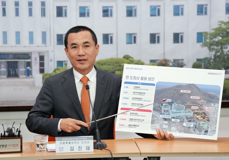 김진태 강원도지사는 23일 도청 브리핑룸에서 '현 도청사 및 부지 활용방안'을 발표하고 상주인력 확보와 관광·문화 기능 확충이라는 '투트랙 전략'을 공개했다. 도는 도청 이전으로 비는 공간에 △출자·출연기관 △공공기관 △사회단체 등 총 16개 기관 500여명 규모를 신속히 입주시켜 인구 유출을 막고 지역 상권을 지킨다는 구상이다.