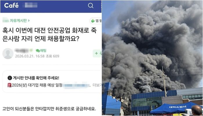 21일 국내 취업 관련 정보를 다루는 네이버 카페에는 “혹시 이번에 대전 안전공업 화재로 죽은 사람 자리 언제 채용할까요?”라는 제목의 글이 올라왔다. 작성자는 “고인이 되신 분들은 안타깝지만 취준생으로서 궁금하네요”라고 물었다.