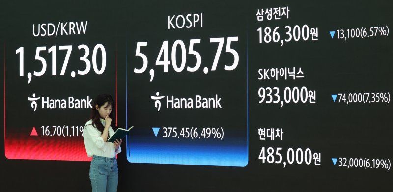 특히 시가총액 상위 종목이 직격탄을 맞았다. 삼성전자는 전 거래일 대비 6.32% 내린 18만6800원, SK하이닉스도 7.15% 떨어진 93만5000원에 각각 거래됐다.